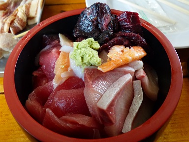 お刺身もお楽しみ頂けます。メニューはマグロ・ブリ・生エビ・コハダ・とろサーモンに加え名物クジラもいただけちゃいます!画像のお肉みたいな色のものがクジラです。平成生まれの私は初クジラでございました(^-^*)意外にあっさりしていて食べやすかったです。海鮮丼なのでもちろん酢飯が用意してあり最初からおひつの中に盛られているので好きな刺身を乗っけるだけ、庄司オリジナルはマグロをこれでもかと載せさせていただきました(笑)