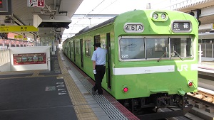 京都からの奈良線は昔の山手線と同じ電車がまだ走っています!一部単線の奈良線は途中宇治などを経由して奈良までを結びます。快速電車以外はちょっと時間がかかることと近鉄と違い、奈良駅はちょっと中心から離れますがなつかしい山手線のイメージそのままの電車でのひと時も是非お楽しみください。京都駅は新幹線のホームのすぐ横あたりから出発します。関西地区ではこのほか阪和線で京浜東北線とおなじ水色の電車が走っています。中央線と同じ朱色の電車は大阪環状線でもうすぐ運行終了になります。関西方面のご旅行の際にはこの3つの路線がいまお勧めです。以上乗鉄情報も交えてお送りいたしました。