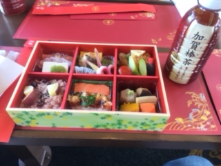 2号だけはお昼時なので加賀屋さんのお弁当とお茶のセットが事前予約で食べられます。こちら2,500円になりますが相席のみなさんも含めて大半の人が注文していたようです。軽食扱いですが、それなりの量もありかなりおいしいお弁当でした。このほか時間帯によってはスイーツセット(1・3号)やお酒とおつまみセット(4号)など、いずれも予約になりますが、車内にて頼みむことができます。ただしお弁当のセットはこの2号(和倉温泉・七尾→金沢)のみになります。日によって違うようですが、車内イベントも行われます。この日は沿線の内灘町の観光案内とおもちの販売でした。特段景色のよい沿線ではないですが、車内内装や展示品見学などを含めて面白い列車だなと思います。特にデザインは女性好みかもしれません。同乗も女性のが多かったです。