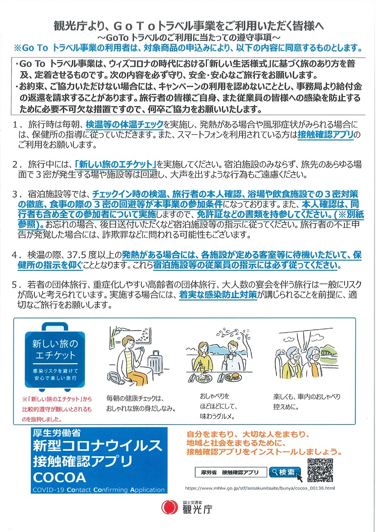 ⇒GoToトラベル事業をご利用される皆様に、感染防止対応として必ず遵守いただく内容でございます。
